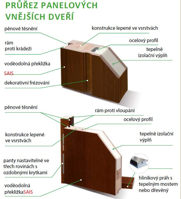 Dřevěná výplň předních dveří - tzv. "sendvič", konstrukce se skládá ze dvou stran, tvoří ji vodotěsné panely z vybraného materiálu, tepelně izolační výplň, těsnění na rámu a dveřích - dvojité těsnění, navíc vyztuženo ocelovým profilem podél celé konstrukce dveřního křídla viz následující obrázek: