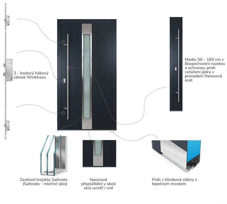 Konstrukce: hliníkový rám, thermoizolační výplň v podobě pěny, 1x těsněnín na zárubních a 1x na dveřním křídle, 5x bodové zamykání na straně zámku, bepečnostní certifikát třídy 2 a třídy 3.